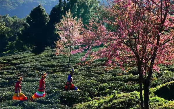 遠遠望去,一排排茶樹像一條條綠色的絲帶,縈繞于山間,一樹樹嬌美的粉色櫻花點綴其間,煞是好看。