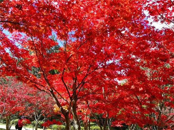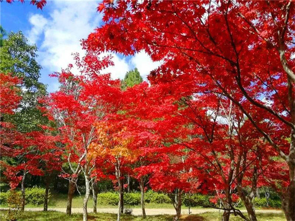在冬日和煦的陽光下,紅葉色彩更加濃艷,微風拂過的瞬間仿若一片燃燒的火海,美不勝收。
