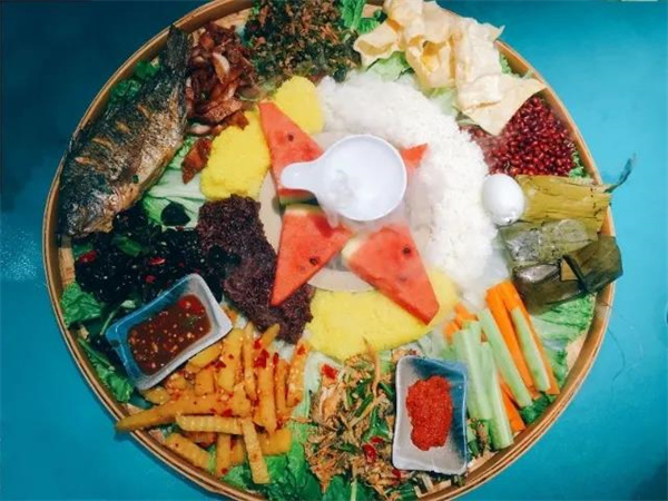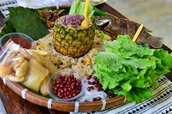 大筲箕上鋪上一層芭蕉葉,將傣族美食集合葷素搭配,加上食材染出的彩色糯米飯和水果,擺出各種精美的造型,用手抓著品嘗,整頓飯都吃得十分獨(dú)特。古樸美味的味蕾盛宴擺脫了傳統(tǒng)餐食的繁文縟節(jié),用原始樸實(shí)的方式呈現(xiàn)在人們面前,頃刻間便能感受到突破桎梏的愉悅,與美味食材親密接觸,回歸質(zhì)樸醇厚的飲食文化之中。