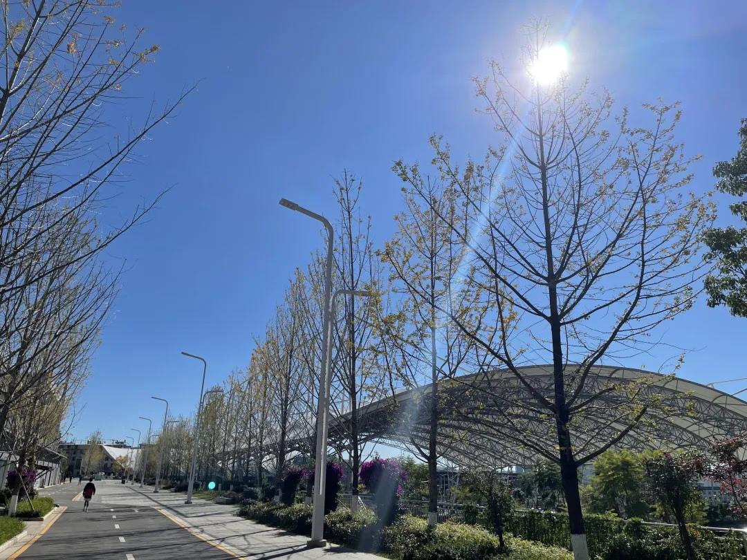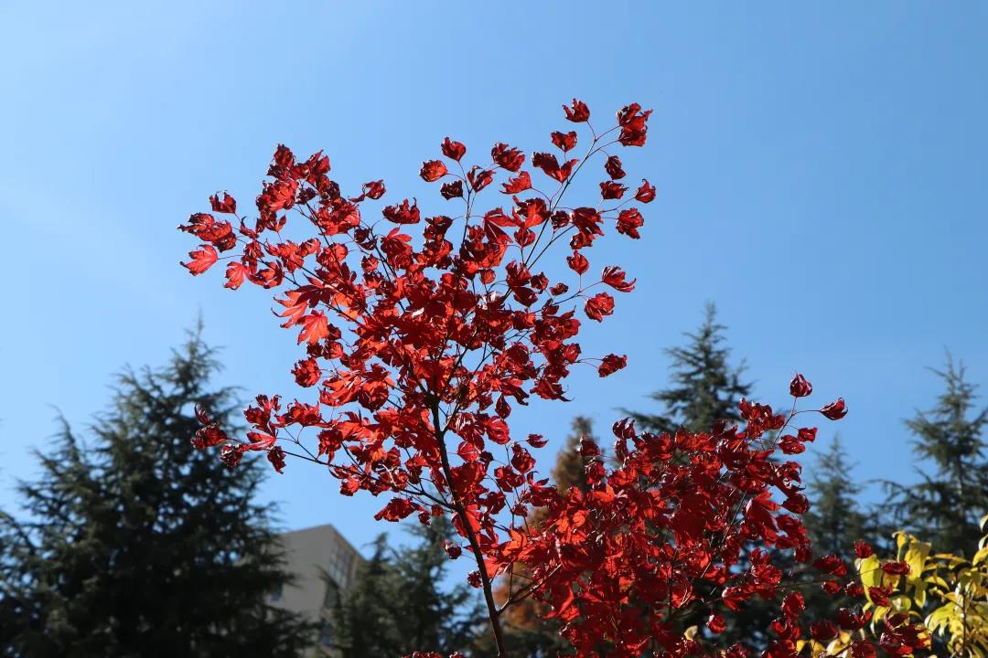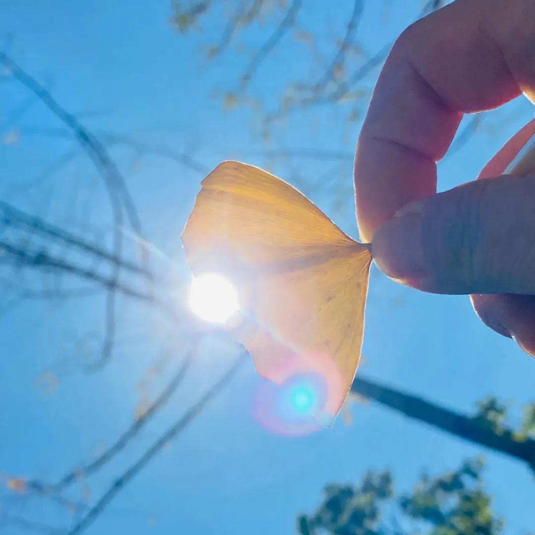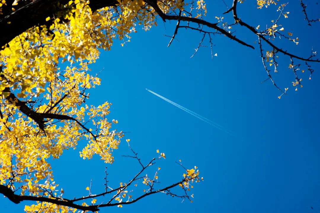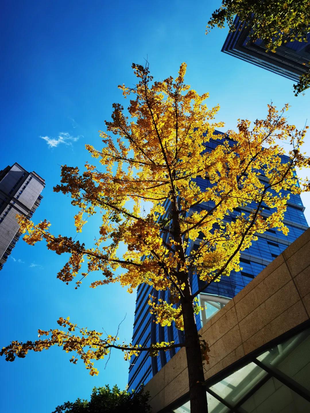 “陽光+藍天+金黃樹葉”的組合