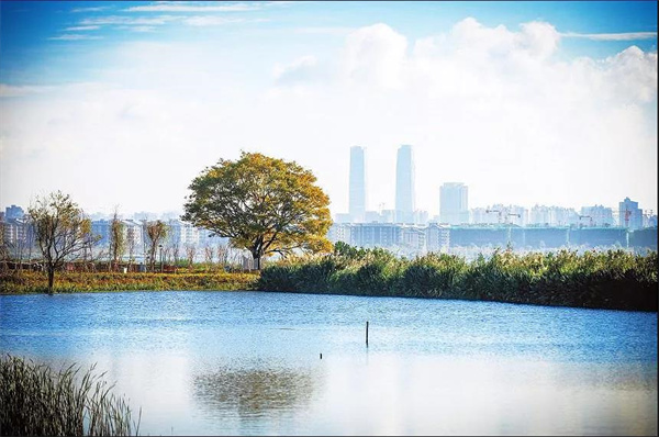 一進(jìn)入星海半島濕地公園,湖畔蘆葦、菖蒲等水生植物叢生,濕地棧道從中蜿蜒穿過(guò),漫步其中,能夠零距離感受濕地野趣。湖塘節(jié)點(diǎn)處還種植了荷花,不時(shí)看到白鷺、喜鵲、翠鳥等野生鳥類,在水草叢中覓食。