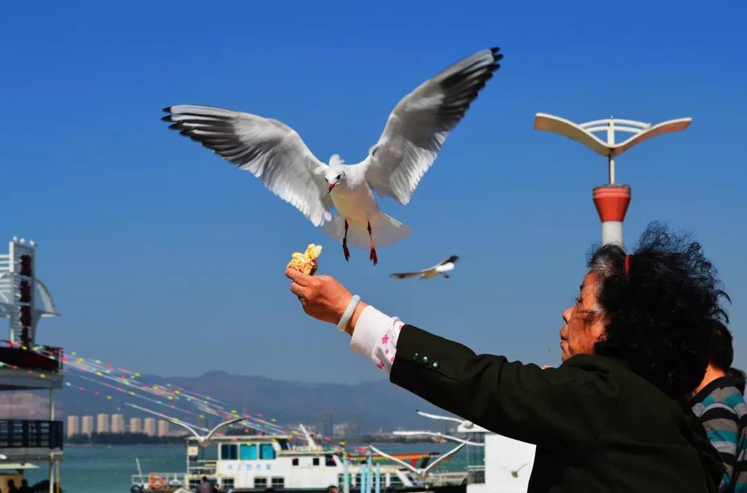 無(wú)論是走進(jìn)翠湖還是海埂大壩,當(dāng)看到無(wú)數(shù)只紅嘴鷗在藍(lán)天里盤(pán)旋、飛翔,你不妨買(mǎi)袋鷗糧喂喂它們,體驗(yàn)一下海鷗從自己高高舉起的手中叼走鷗糧的那份親密感。