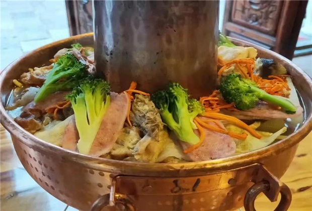 烹飪時,在鍋內底部先鋪上一層蔬菜、粉絲、山藥等素菜,上層再將制作好的酥肉、丸子、豆腐等食材放好,擺上現切的火腿片、鮮肉片等,加入燉好的高湯,點燃木炭,待食材吸收了炭火的溫度,浸泡著湯汁的食材味道相互融合,便可享用湯鮮肉美的炊鍋了。