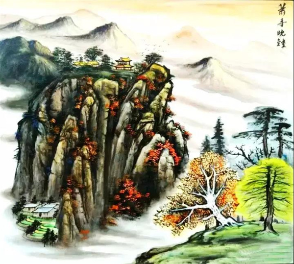 殘陽余曜古寺輝,群山滴翠倦鳥歸。