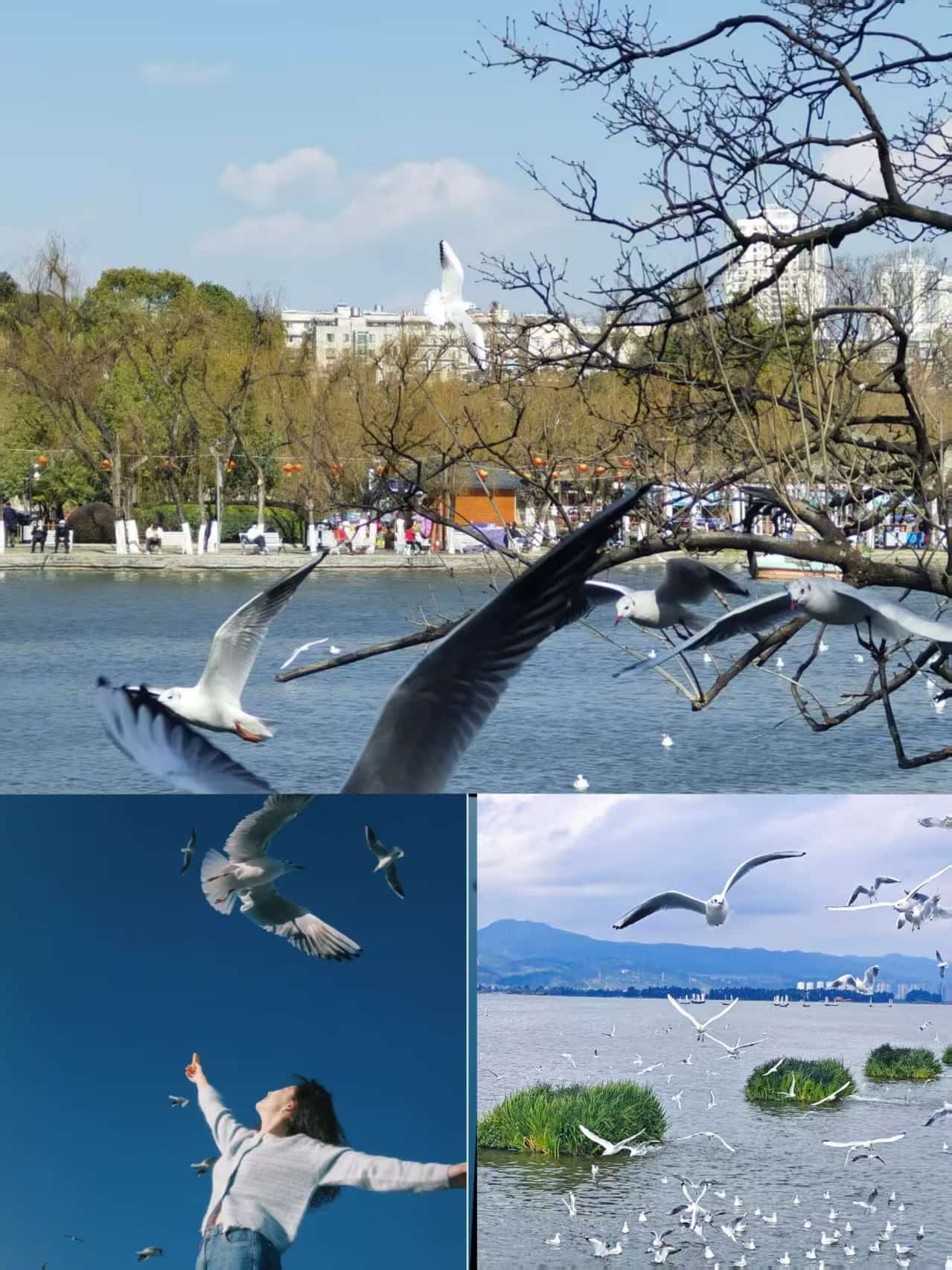 清晨六點(diǎn)半,當(dāng)?shù)谝豢|陽(yáng)光灑向滇池,海埂大壩已悄然蘇醒。成千上萬(wàn)只紅嘴鷗從西伯利亞飛抵此地,或掠過(guò)水面捕食,或盤旋在游客頭頂鳴叫。帶上兩包鷗糧(5元/包),伸出手掌,這些“白色精靈”便會(huì)輕盈落下,啄食時(shí)翅膀撲簌簌的觸感,讓人忍不住笑出聲。