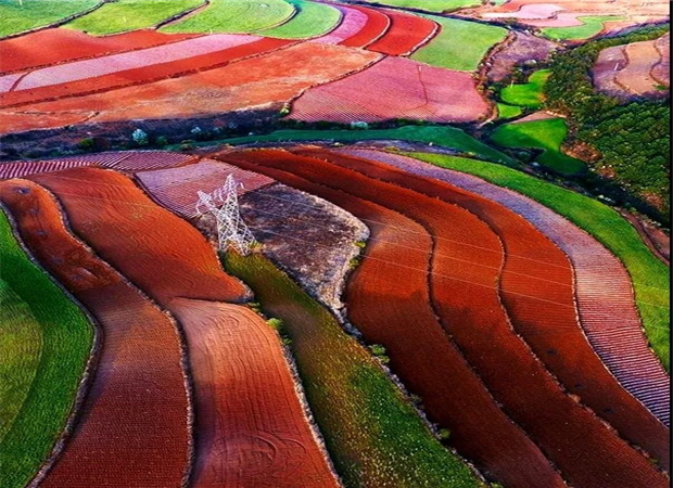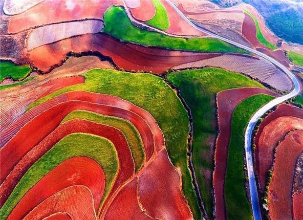 東川紅土地景區(qū),位于云南省昆明市東川區(qū)紅土地鎮(zhèn),獨特的紅色土壤成片地覆蓋在蜿蜒起伏的山地上,與綠色的莊稼、銀灰色的道路、白色的村莊等交相錯雜,形成了一幅幅色彩斑斕、絢麗多姿的巨幅“油畫”。