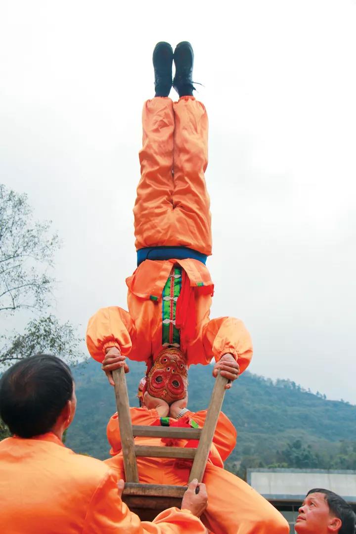 “鉆圈難就難在表演者需要連下5圈,最后雙手懸空倒掛在最后一圈,時間在1、2秒內,動作還要精準流暢。”竹竿頂端表演者垂直距離地面足有兩層樓高,可謂驚險刺激,觀者無不屏息凝神,拭目以待,高竿舞獅因此又被昭通作家譽為“針尖上的舞蹈”。