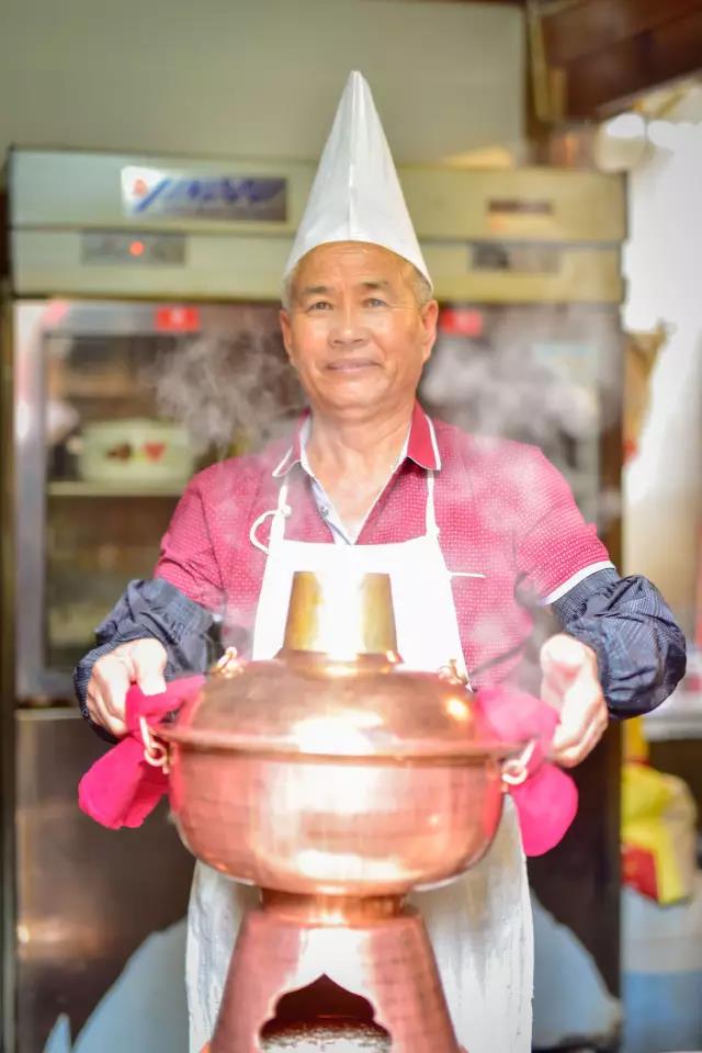 先將熬制好的高湯盛入銅鍋,放入些許鹽、胡椒等調料,舀入幾勺豬油,蓋上鍋蓋,在煙囪中加入無煙碳生火,等待高湯煮沸。高湯由店主憑借自己幾十年的經驗,獨家熬制。“放入土雞、排骨、筒子骨、老鴨同煮,水沸之時,拂去沫子,待用筷子能戳穿肉時取肉,再等雞能被戳穿時,取雞,約一小時許,然后再把筒子骨取出,涼后剔肉,肉涼拌或打蘸水食之。此時湯鮮、色白,可謂高湯。古人無味精,故用雞、骨等熬制成高湯,可當味精,故而炊鍋一般不放味精,放適量鹽即可。”馬姐告訴我們,熬制高湯用的都是礦泉水。
