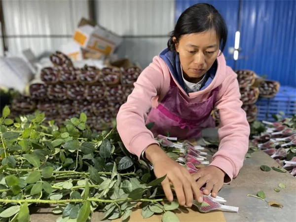 來到村里鮮切花分級的場地,村民們熟練地分揀、包裝著玫瑰花。正在包裝玫瑰花的李春燕告訴記者:“我們一天到這里打工有一百多元的收入,就近打工也比較方便?!?br />