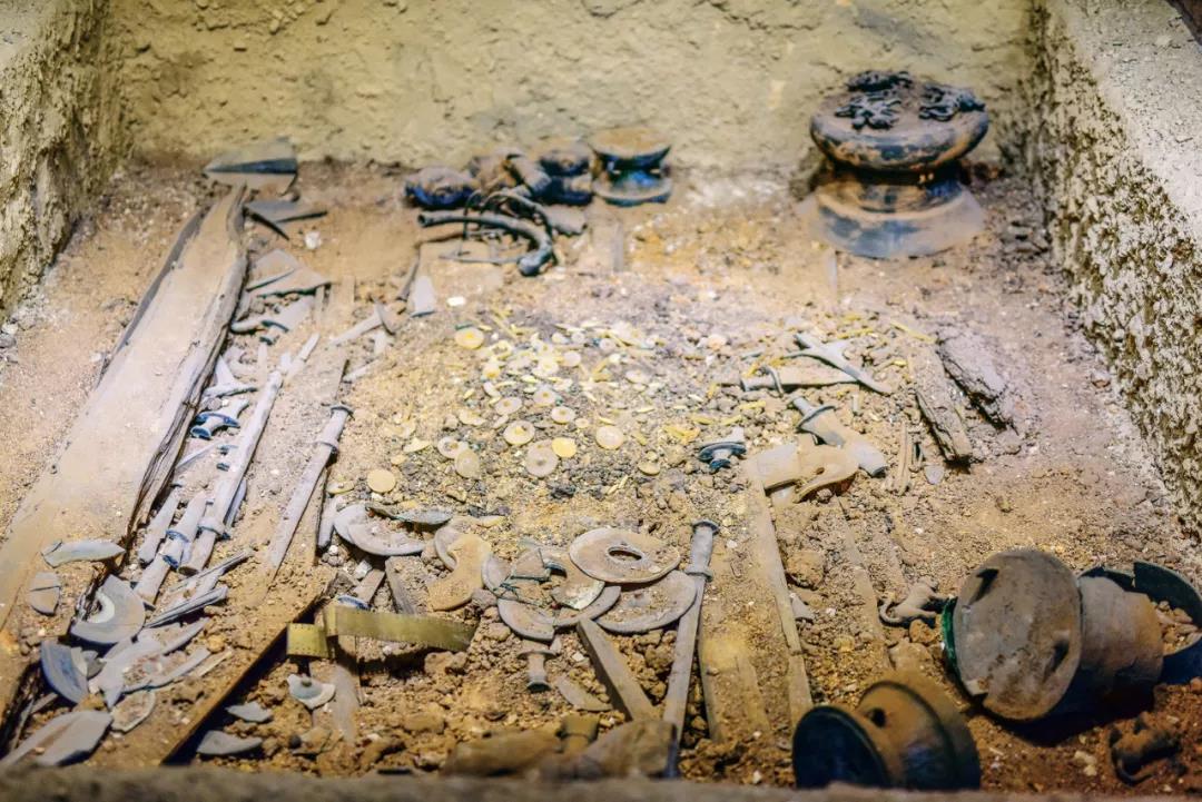 在楚雄青龍河畔的萬家壩古墓群遺址約3000平方米的區域內曾發現了79座古墓,皆為豎穴土坑墓,其中大墓13座。大墓分布在發掘區中部,小墓則分布在大墓兩側,這種以大墓為中心,中小墓圍繞周圍的墓葬分布形式反映出原始氏族部落社會族葬制的特征。萬家壩共出土了隨葬器物1245件,其中銅器1002件,其余有陶、木、玉石等。其中出土的銅鼓有5面,是迄今為止發掘出土的最古老的銅鼓,是銅鼓中最原始的形態,年代上限可以推到春秋時期。萬家壩古墓群遺址如今是楚雄的一個旅游景點,除了一個銅鼓魂雕塑,遺址現場已無更多的古墓痕跡。然而作為春秋戰國時期的墓葬群遺址,這里還是吸引著不少游客。據當地人說,遺址附近前不久新修了一個停車場,與銅鼓魂雕塑一道,迎來送往。
