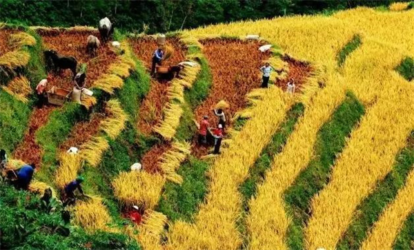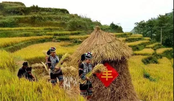 打稻谷的時(shí)候,先由老人做個(gè)祭祀儀式,打死一只雞獻(xiàn)給天地和稻神,感謝他們給予的豐收。整座山頭,伴著割稻鐮聲一起歡騰了起來。