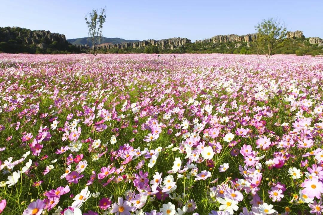 平日的石林是灰色的,而到了金秋,石林就會變成粉色的花海,乃古景區的上千畝波斯菊競相開放,柔美的花海搭配壯麗的石山,絕對是最美的人間仙境。