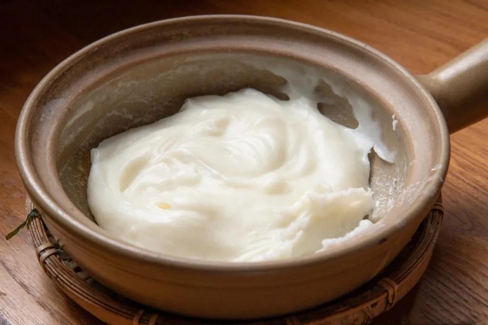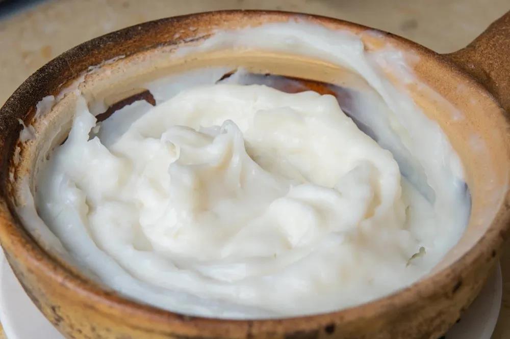 這是一道老昆明甜品,將大米打磨成粉后加入新鮮牛奶,過篩后獲得更加細(xì)膩的質(zhì)地,然后裝入小砂鍋中不斷加熱攪拌至粘稠即可。